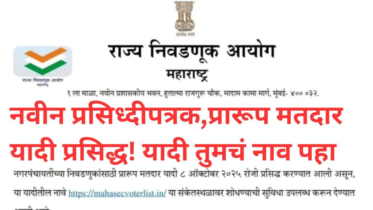 राज्यातील जिल्हा परिषदा / पंचायत समित्या आणि नगरपरिषदा/नगरपंचायतींच्या निवडणुकांसाठी प्रारूप मतदार यादी ८ ऑक्टोबर २०२५ रोजी प्रसिद्ध करण्यात आली असून, या यादीतील नावे https://mahasecvoterlist.in/ या संकेतस्थळावर शोधण्याची सुविधा उपलब्ध करून देण्यात आली आहे.