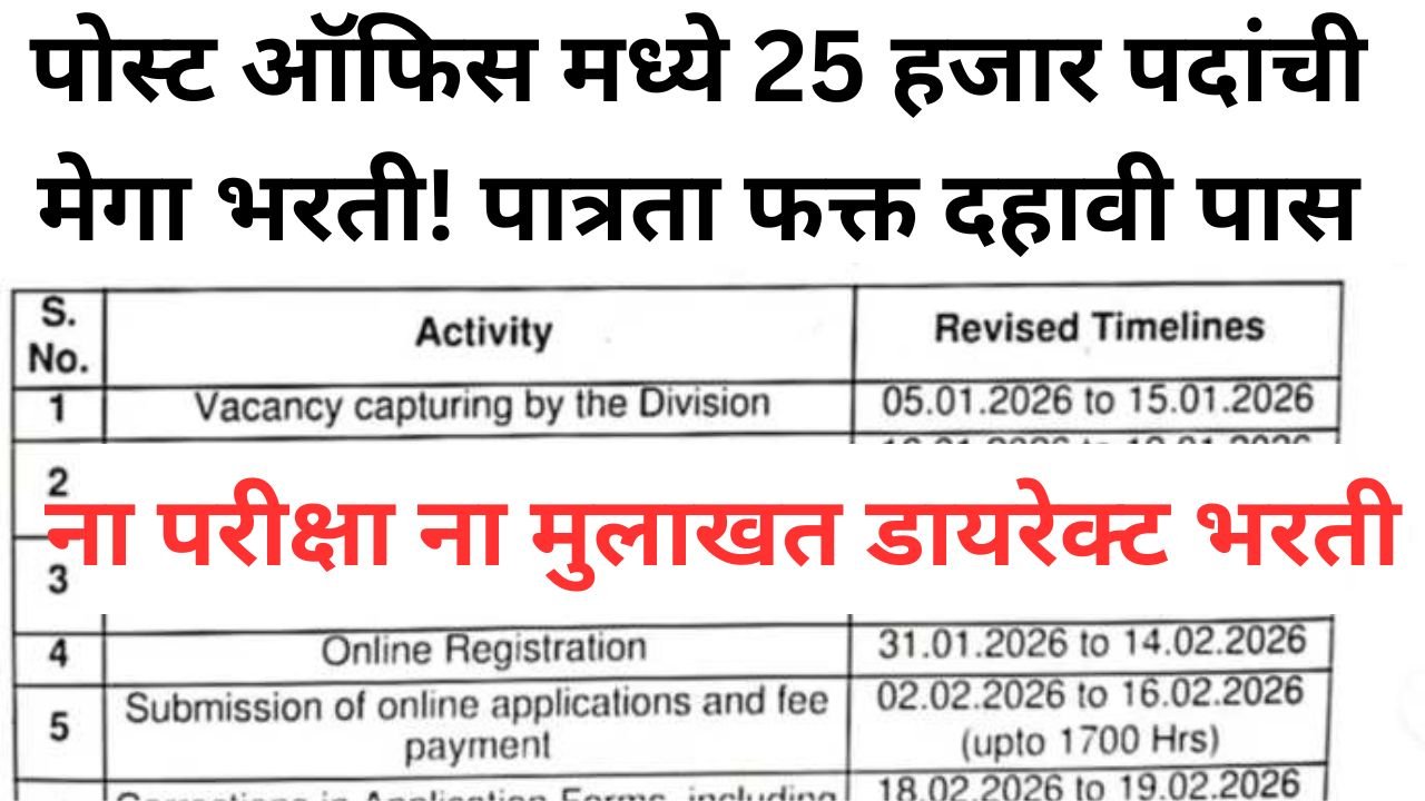 ना परीक्षेचे टेन्शन ना मुलाखतीचे,पोस्ट ऑफिस मध्ये 25 हजार पदांची मेगा भरती! पात्रता फक्त दहावी पास…India Post Recruitment 2026