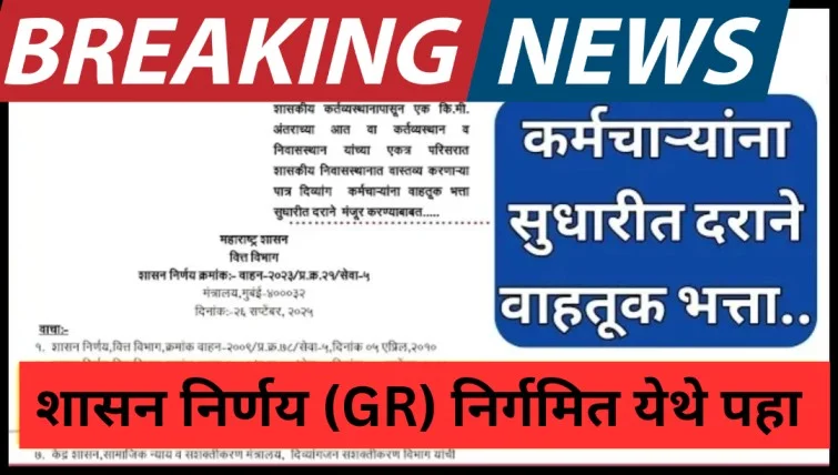 केंद्र शासनाच्या धर्तीवर कर्तव्यस्थानाच्या एक किलोमीटर अंतराच्या आत वा कर्तव्यस्थान व निवासस्थान यांच्या एकत्र परिसरात शासकीय निवासस्थानात वास्तव्यास असणाऱ्या दिव्यांग कर्मचाऱ्यांना वाहतूक भत्ता सुधारीत दराने अनुज्ञेय करण्याची बाब विचाराधीन होती.